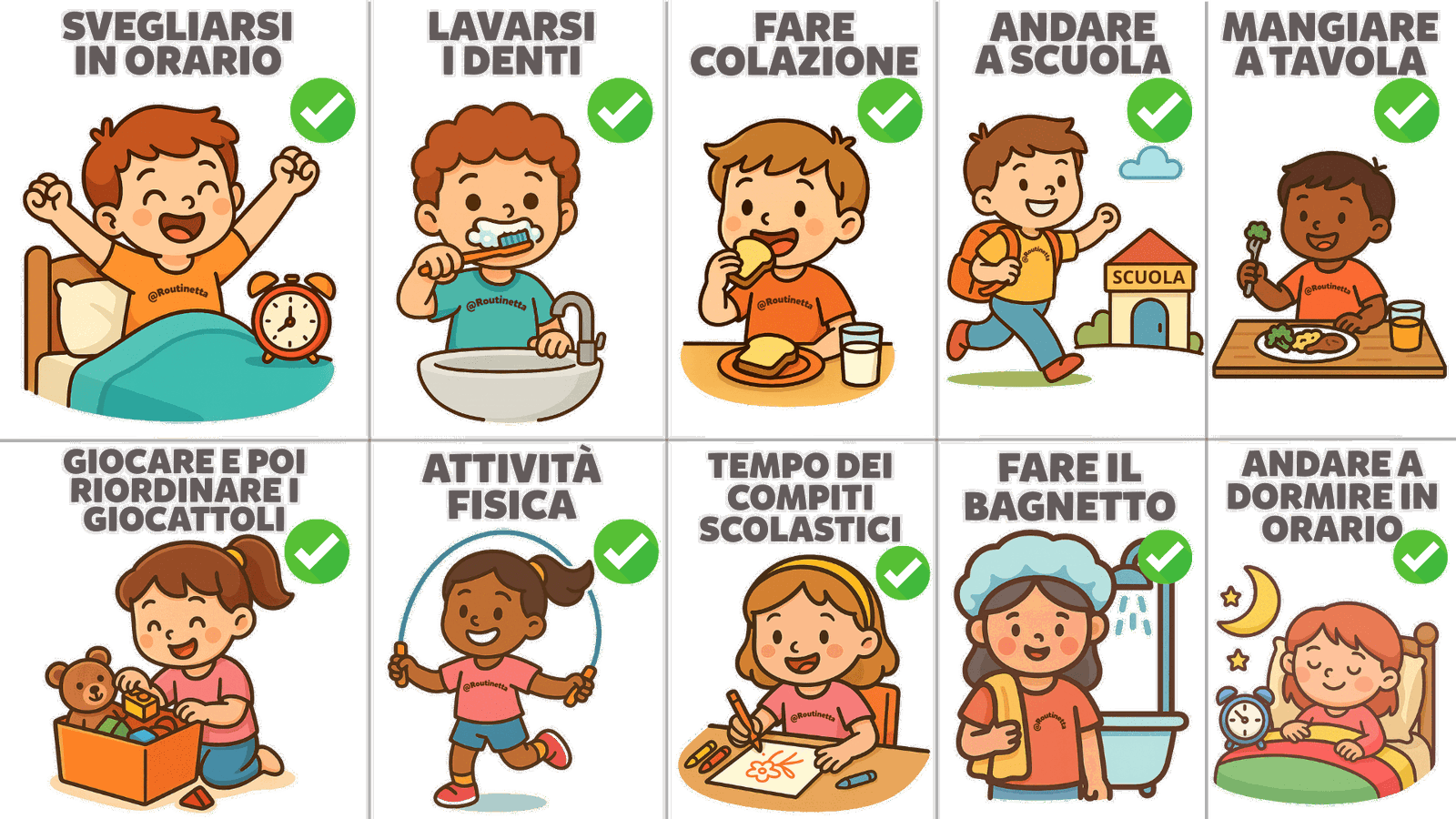 Include routine per l’igiene, l’alimentazione, lo studio, gli orari e il buon comportamento.